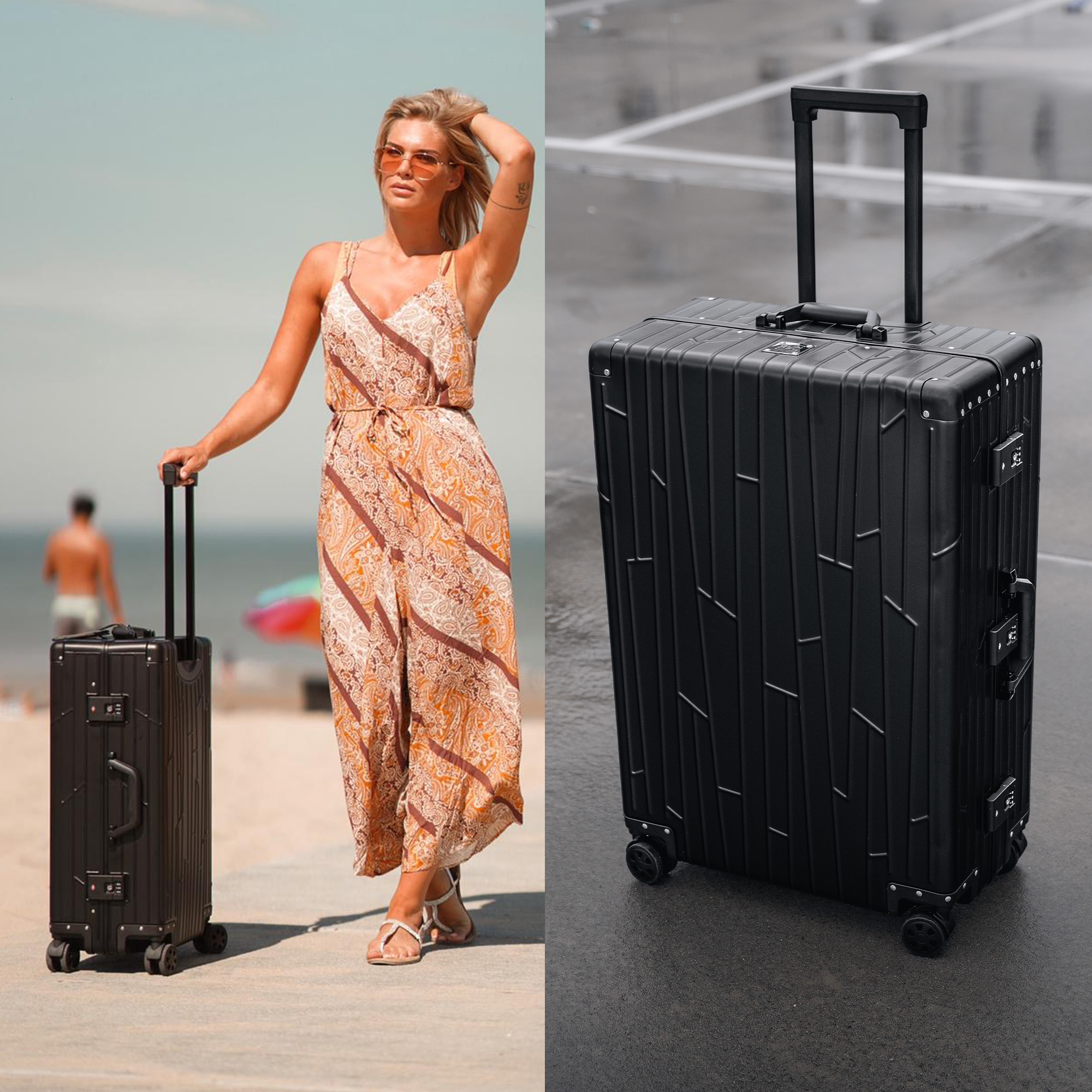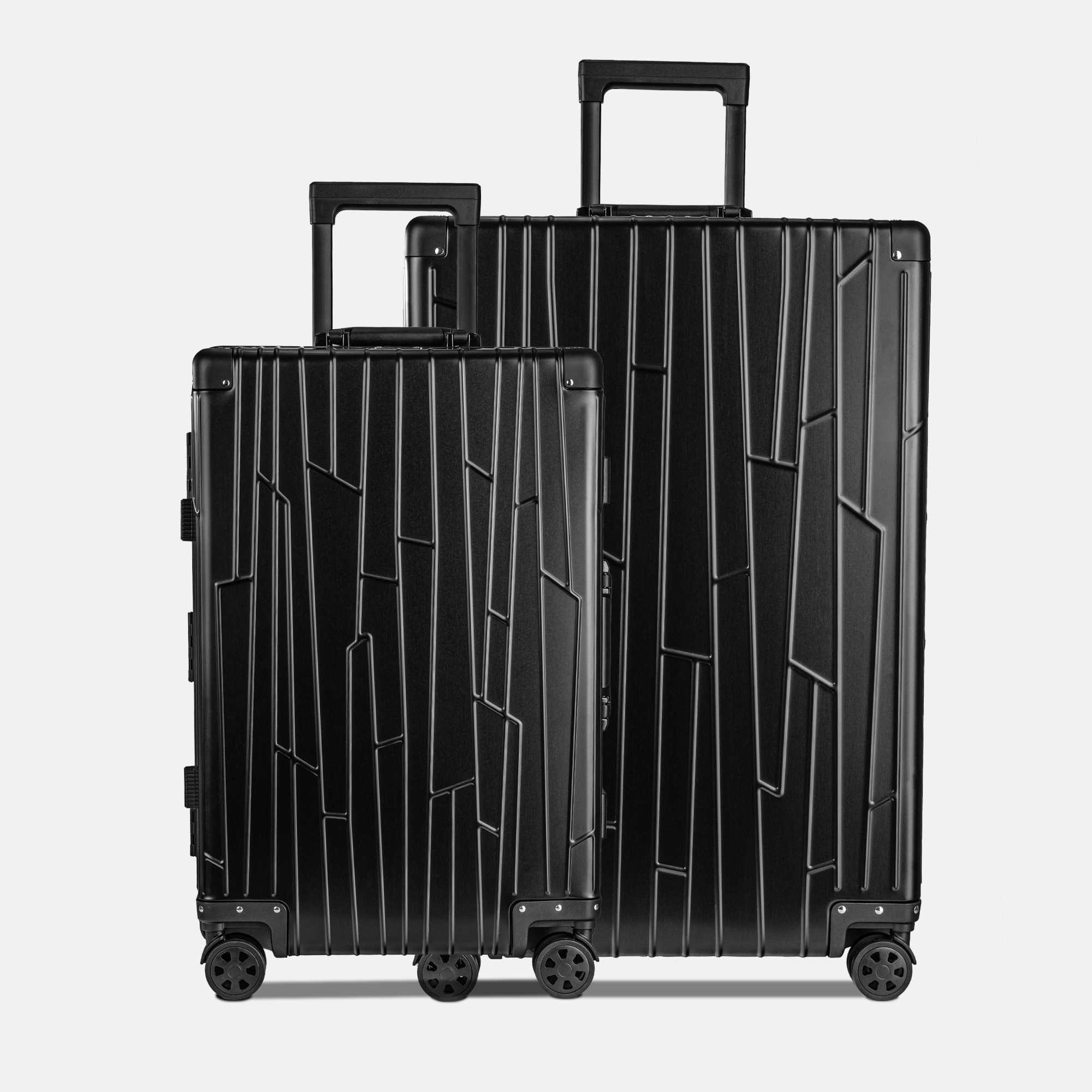 Zwei GUNDEL Koffer in schwarz, schräg stehend, mit Linienmuster, Teleskopgriffen und TSA-Schlössern vor weißem Hintergrund.