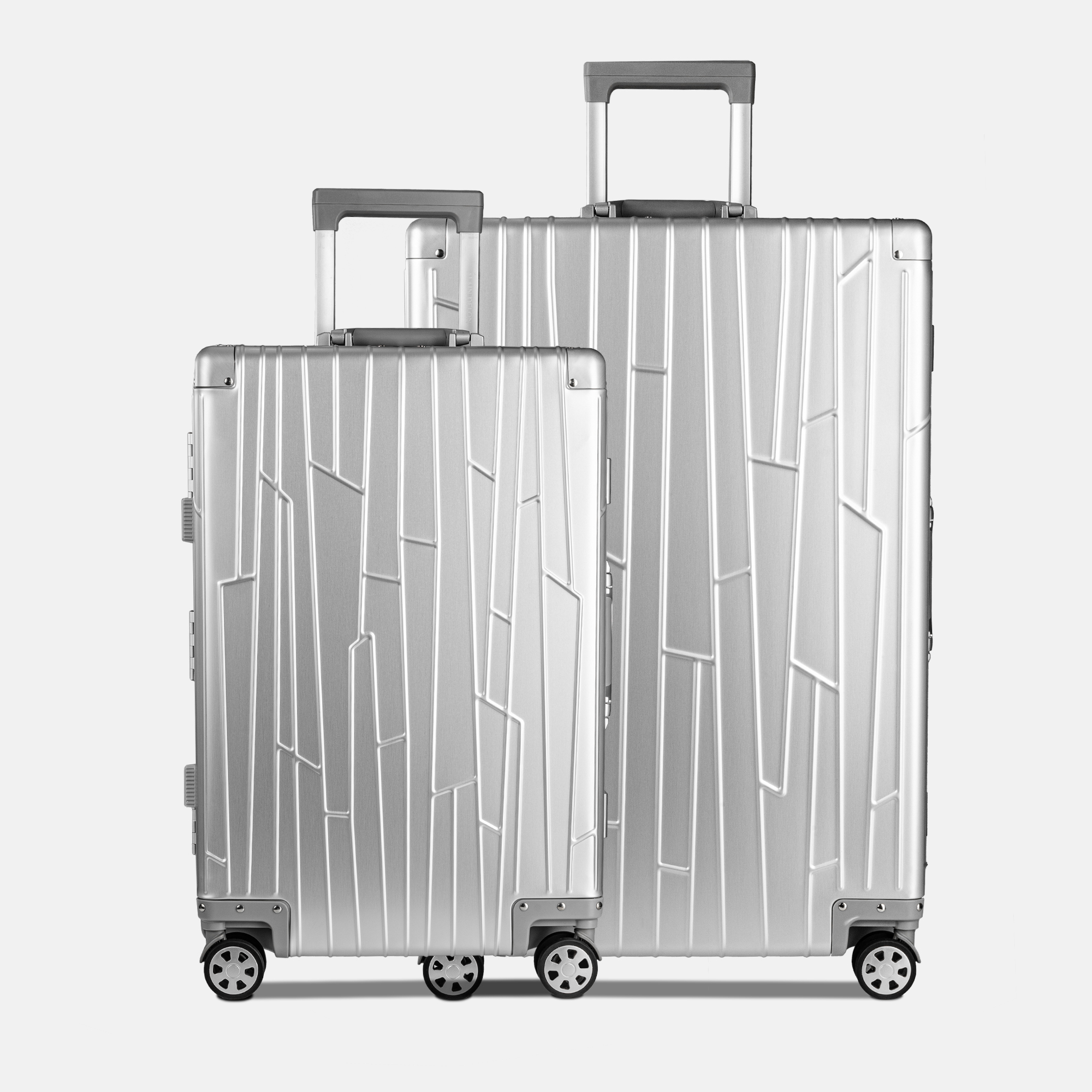 Zwei GUNDEL Koffer in silver in Frontansicht mit Linienmuster und Teleskopgriffen - stehen nebeneinander vor weißem Hintergrund.