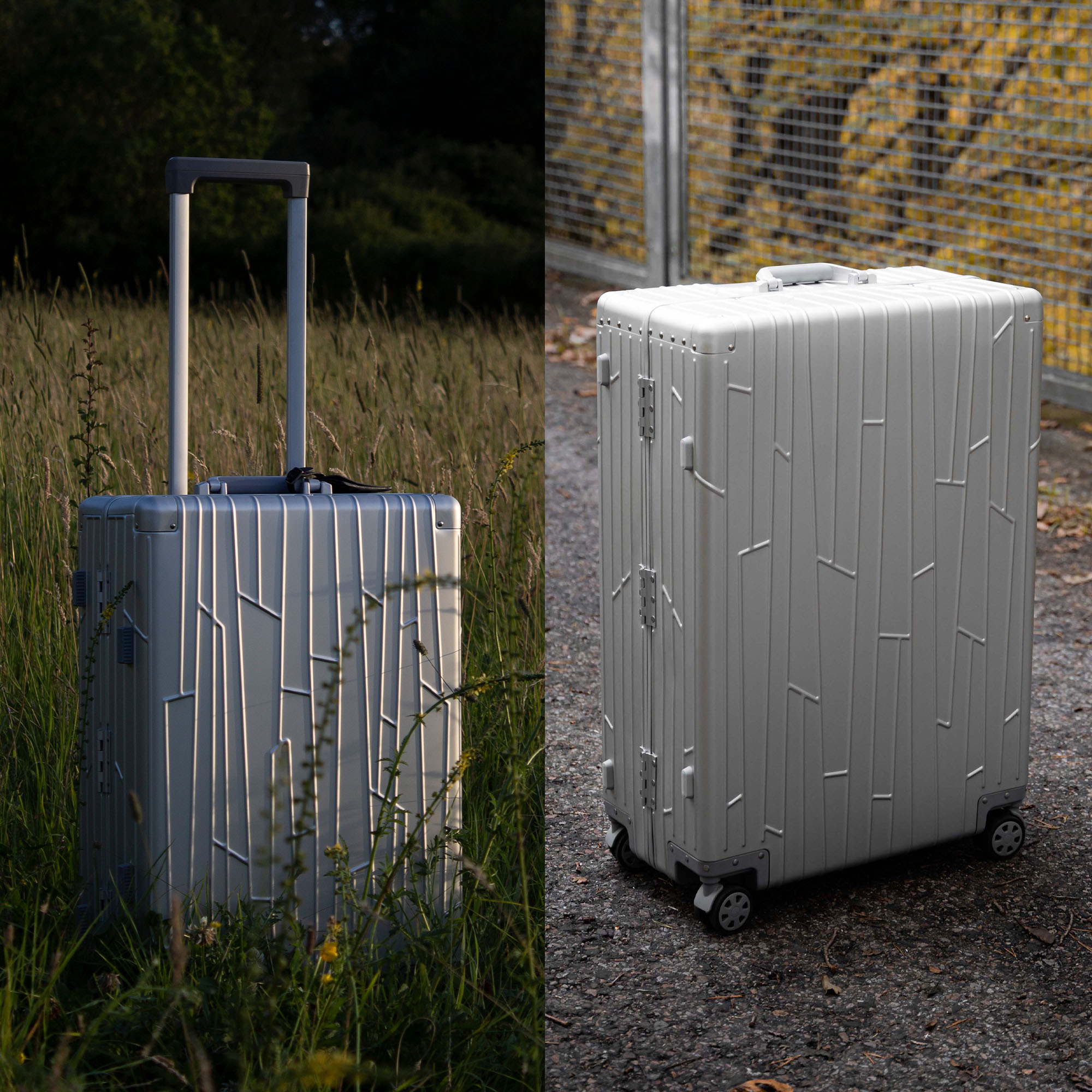Nahaufnahme eines silbernen GUNDEL Koffers mit Fokus auf das Rad und das Linienmuster.