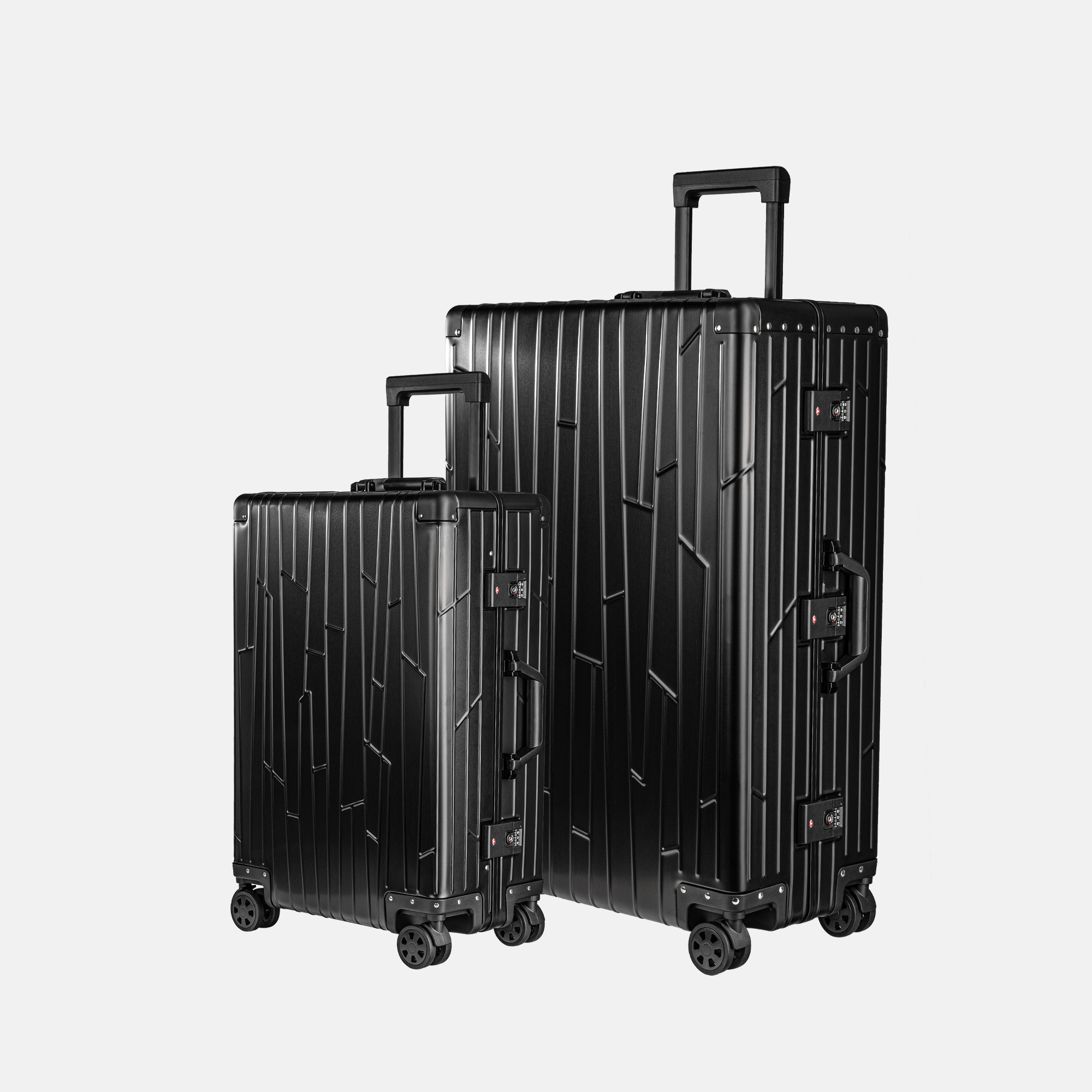Zwei GUNDEL Koffer in Schwarz, schräg stehend, mit Linienmuster, Teleskopgriffen und TSA-Schlössern vor weißem Hintergrund.